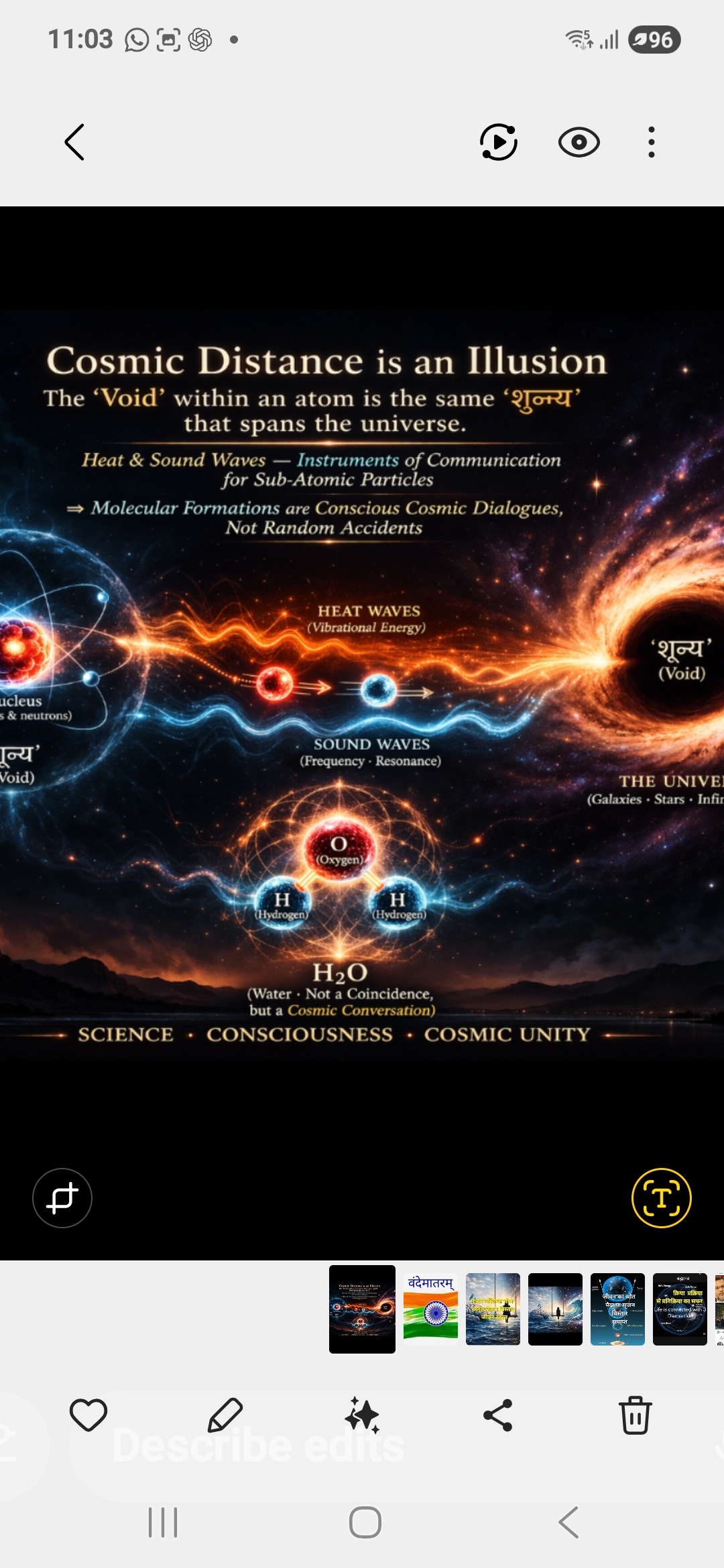 “Cosmic distance is an illusion. The ‘void’ within an atom is the same ‘void’ that spans the universe. This post explores how heat and sound waves act as ‘instruments’ for sub-atomic particles to communicate, proving that molecular formations like H_2O are not random mathematical accidents but conscious cosmic dialogues.”