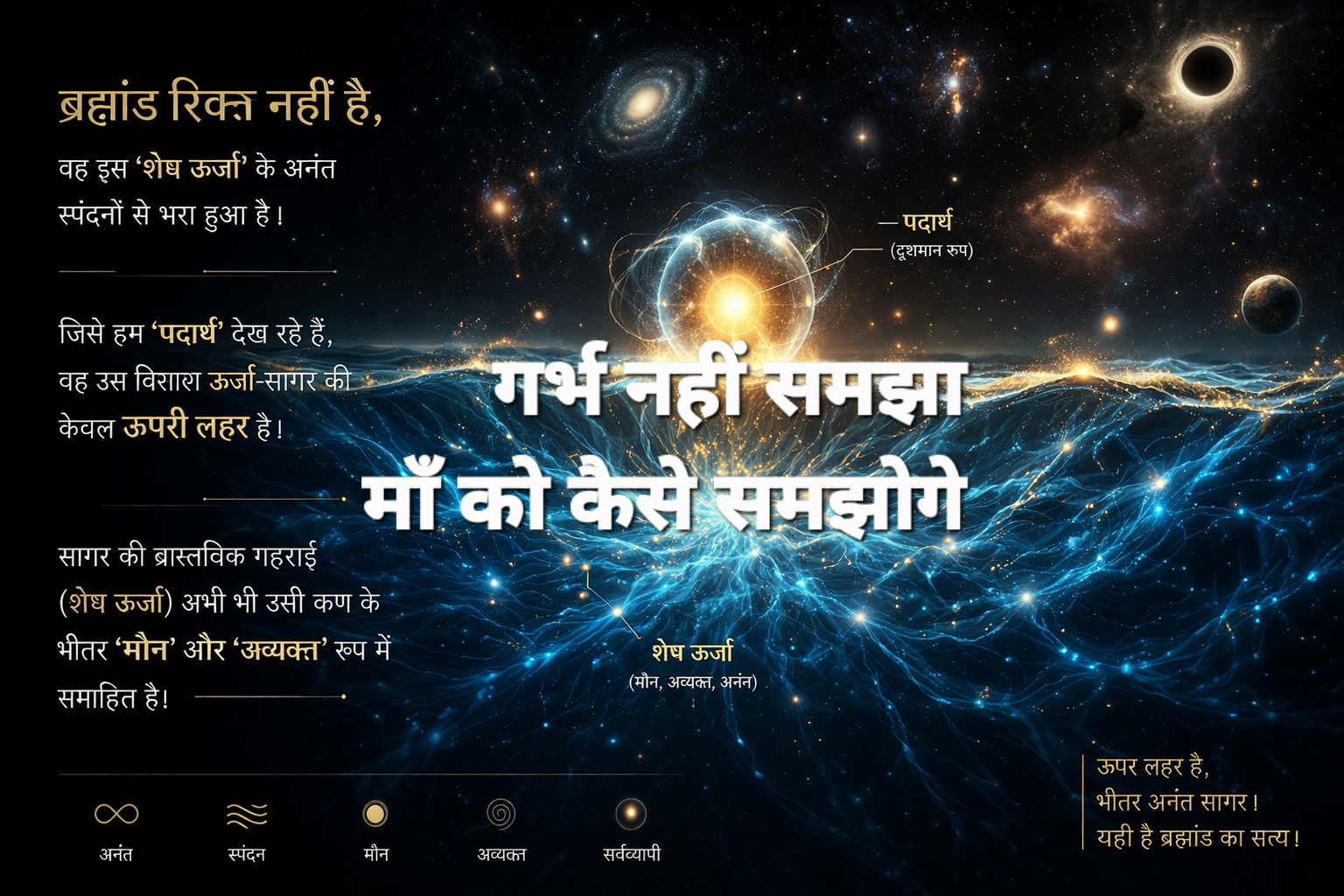 ब्रह्मांड रिक्त नहीं है, वह इस ‘शेष ऊर्जा’ के अनंत स्पंदनों से भरा हुआ है। जिसे हम ‘पदार्थ’ देख रहे हैं, वह उस विशाल ऊर्जा-सागर की केवल **ऊपरी लहर** है। सागर की वास्तविक गहराई (शेष ऊर्जा) अभी भी उसी कण के भीतर ‘मौन’ और ‘अव्यक्त’ रूप में समाहित है।